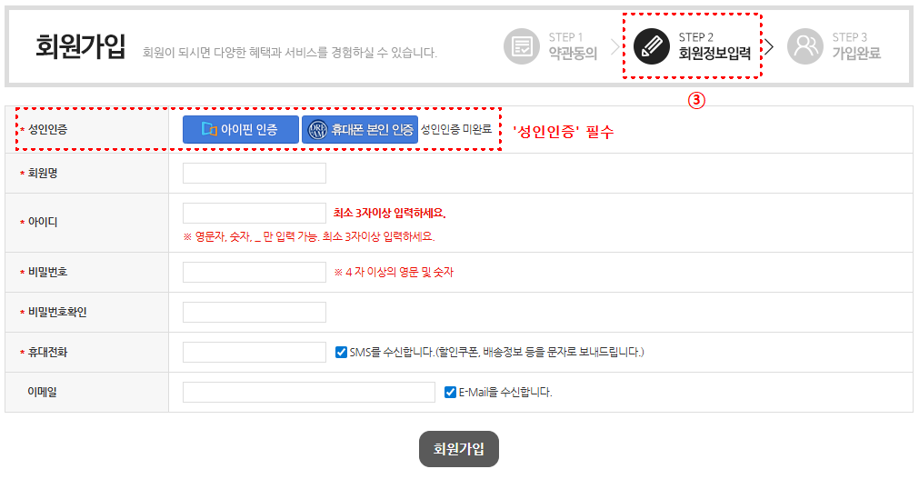 회원 정보를 작성하기 전에 성인인증을 먼저 하셔야 합니다.