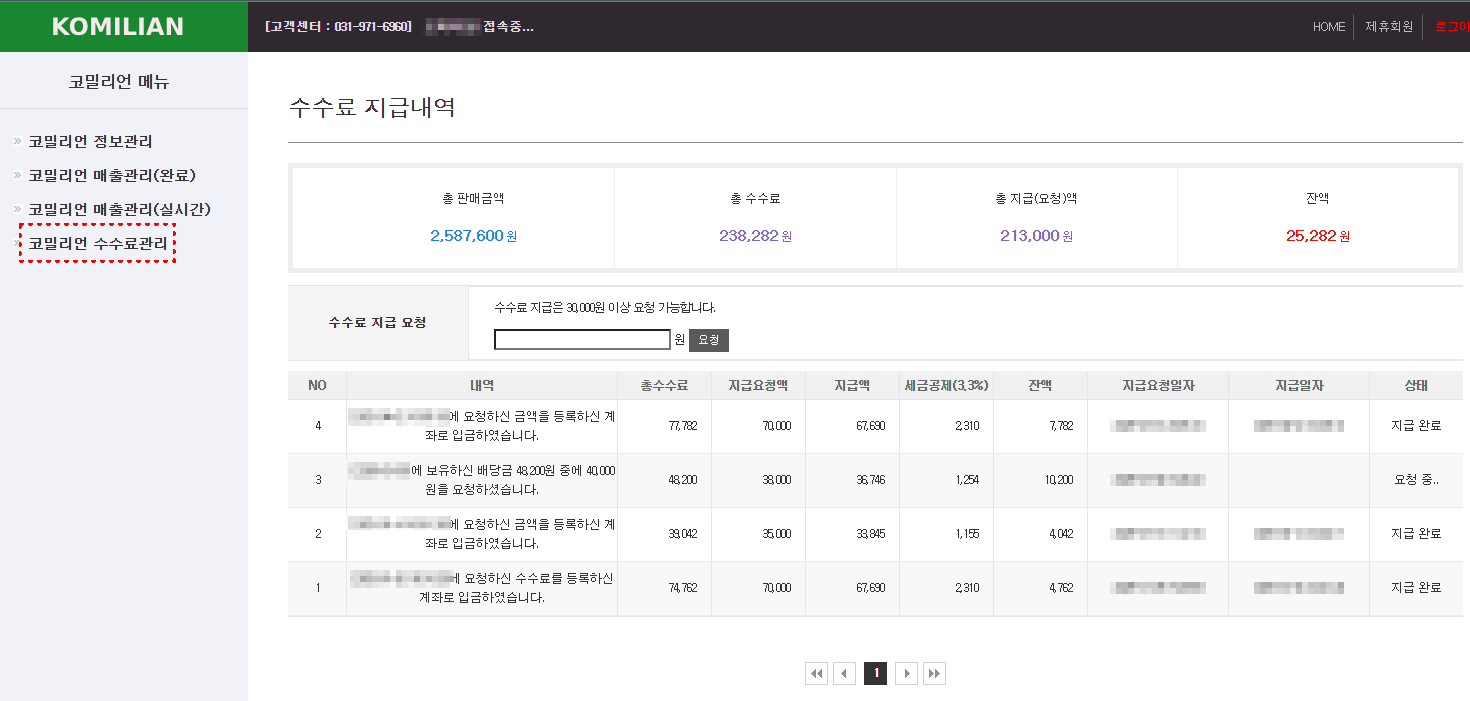 현재까지 발생한 매출과 수수료 현황을 자세히 확인할 수 있고, 이 페이지에서 수수료 지급을 요청하실 수 있습니다.(잔액이 30,000원 이상인 경우)